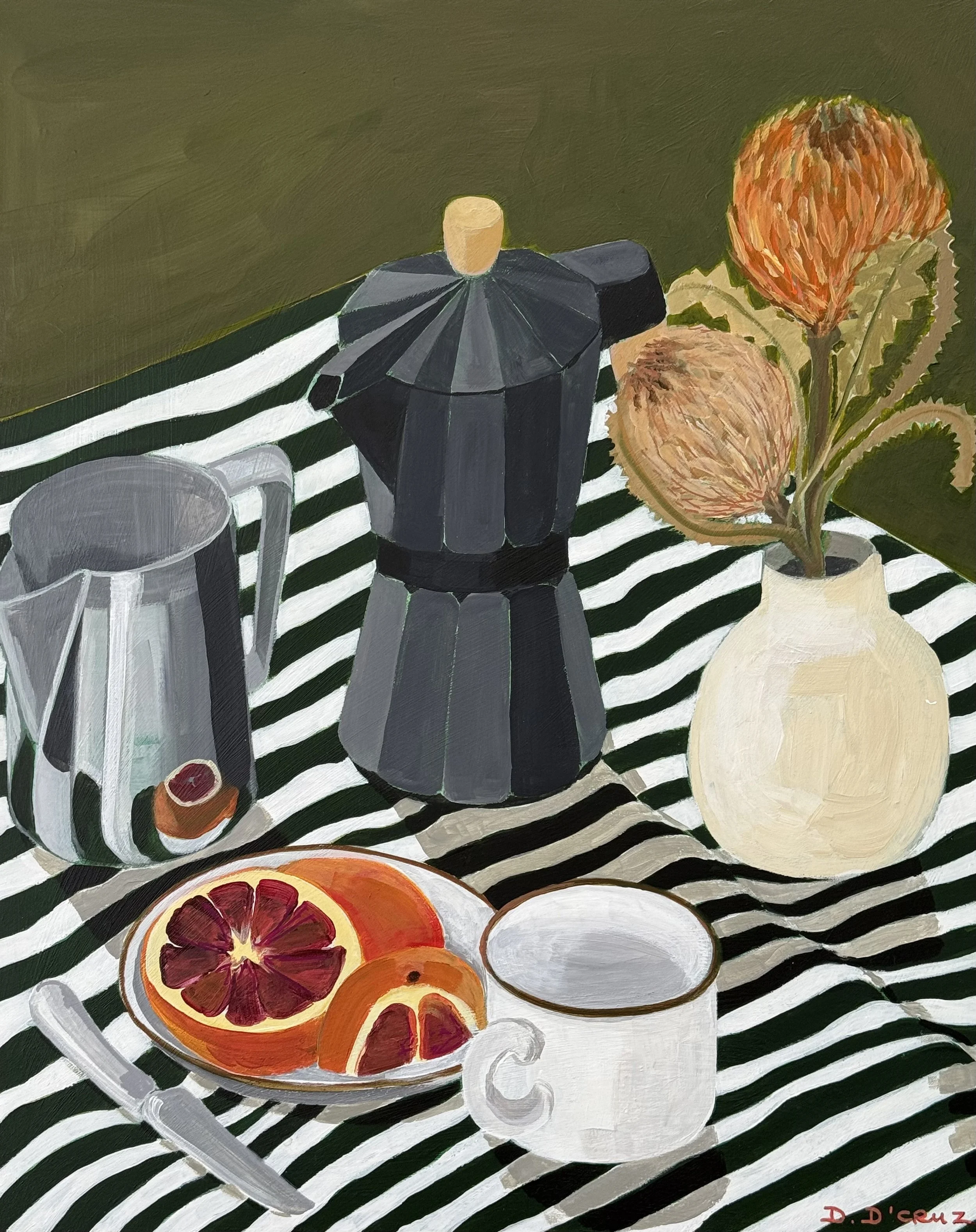Daniella D’Cruz is a UK born still life artist based in Brisbane, Queensland. Her richly layered paintings celebrate everyday rituals — citrus on striped cloth, coffee cups mid-conversation, flowers gathered from the garden — each composition infused with nostalgia, warmth, and quiet reverence.